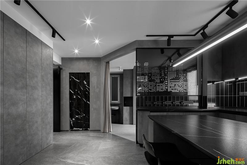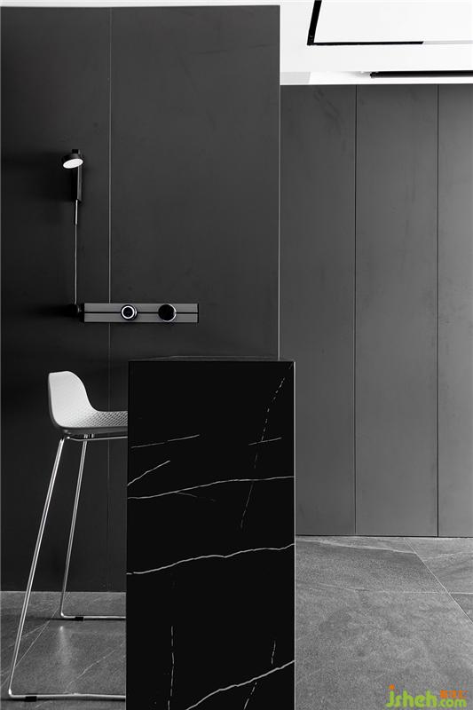 吧台后方利用墙体做了到顶的收纳柜,中间留空部分可放置一些小摆件,储物功能多样化。石材吧台与哑光石材地面反射出的光影给人带来一丝高冷的气息。
