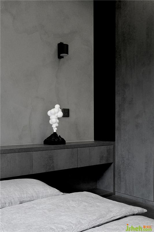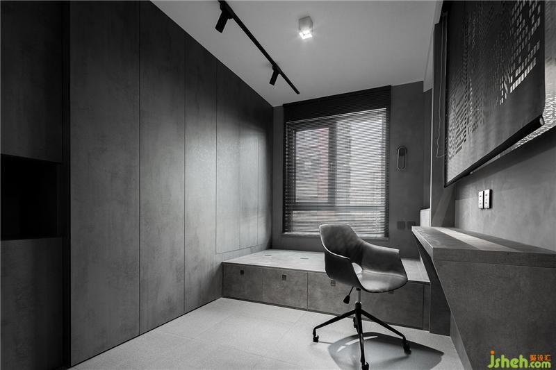 又是三种灰色系材质搭配的空间。衣帽间柜门的镜面效果反射产生的光线对空间进行提亮,搭配中间水泥色首饰柜时刻透露出优雅的气息。