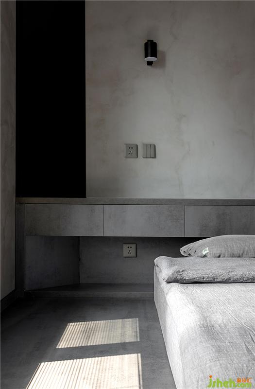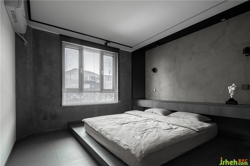 卧室床头以及靠窗的墙面涂刷了水泥漆,给人一种粗狂原始的感觉,让工业风格体现的更加淳朴。床头安装重色的N字形背景墙,能够使空间的色调更沉稳。下方整排的床头柜既美观又实用,储物抽屉也能容纳零碎的卧室杂物。
