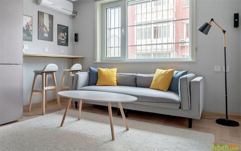 客厅沙发一角浅灰色(太空漫步)墙漆面,灰色的布艺沙发搭配着暖灰色的地毯,让整体的空间统一舒适。