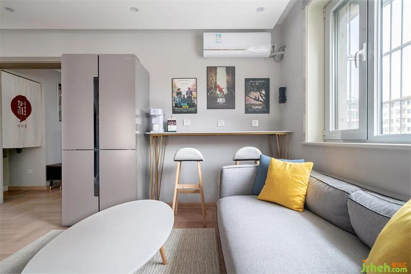 从落地灯方向往吧台区看,把原来在厨房空间的冰箱挪到了客厅区域,并把原来的600的冰箱,更换成了910的冰箱增加了储藏空间。