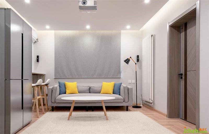 客厅没有要边柜,把空间预留出来做吧台,这样可以把咖啡机,榨汁机,茶具等在这里进行摆放,这样招待客人就不需要去厨房进行操作。吧台前方摆放吧椅,平时的时候屋主可以在这里品酒,也和与客厅沙发形成了半围合式的空间。另一侧的落地灯在平时晚上观影的时候,可以做为照明使用。