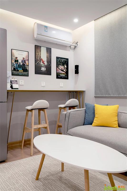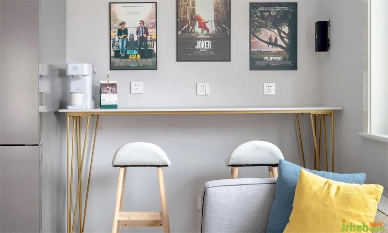 吧台区域灰色墙面,墙面悬挂的都是屋主喜欢的电影宣传海报。吧台的材质是金属与石材的结合。