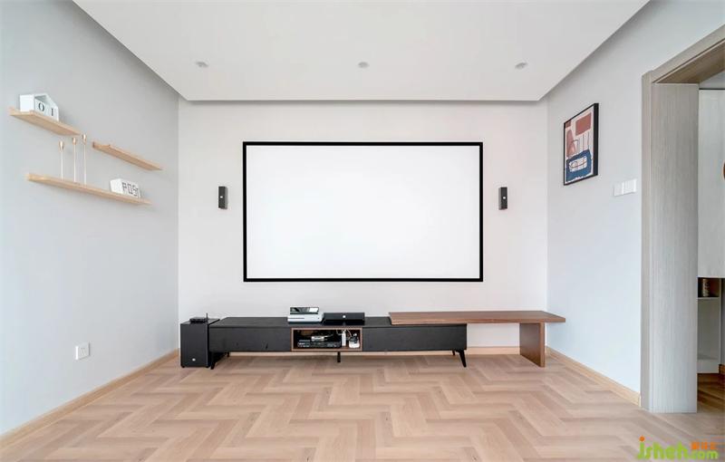 正面看幕布区域,墙面的幕布是固定在墙面上,没有暗藏在吊顶内部。电视柜选择的是可拉伸式,能根据需求进行伸缩。电视柜的抽屉,可以放一些客厅杂物,中间的开放格可以放机顶盒等设备。
