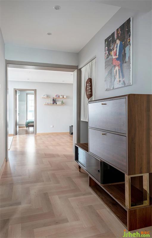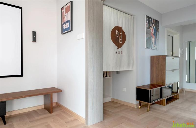 门厅区域入户后在门的右手边摆放了成品鞋柜,在门厅鞋柜上方是屋主自己绘画形象照。原有的杂物间是封闭式的,打开后没有足够的活动空间,所以杂物间区域就采用了布帘的方式,扩大杂物间的活动空间以及间接的扩大了杂物间。