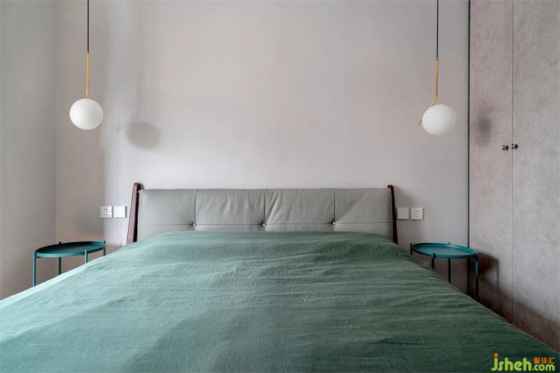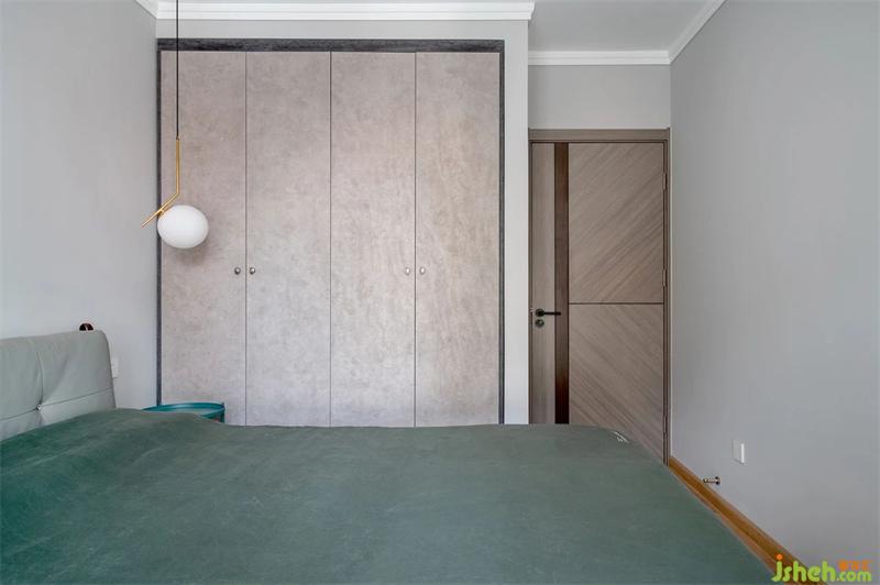 主卧床头一角。衣柜一侧靠近床头位置的柜门是固定扇,避免床头柜和吊灯相互干扰。衣柜门是灰色水泥漆,面板与灰色墙漆相呼应。