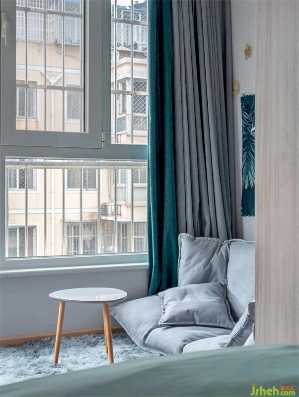阳台一侧蓝青色的遮光帘,与沙发背后的挂毯的颜色相结合。阳台空间是做为客厅的休闲区使用。平时屋主可以在这里阅读、听歌。