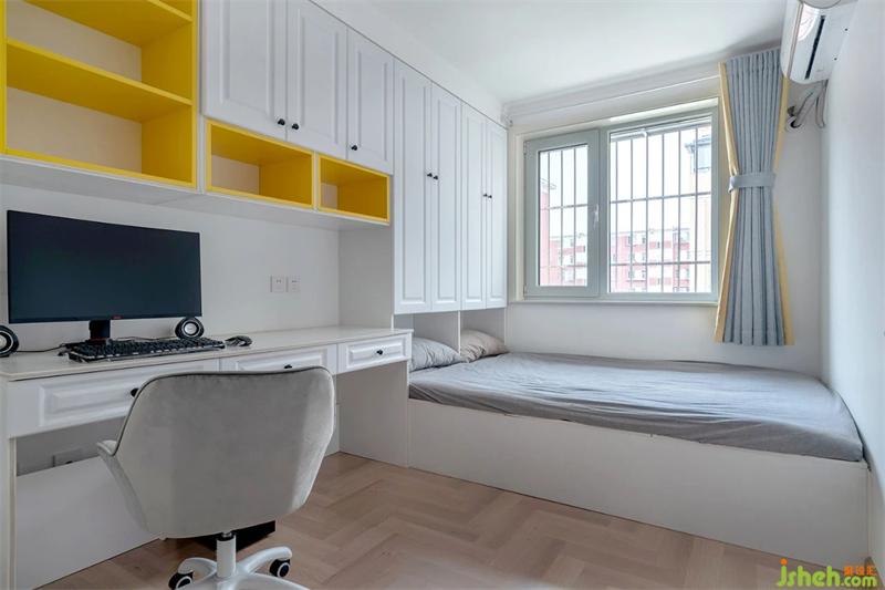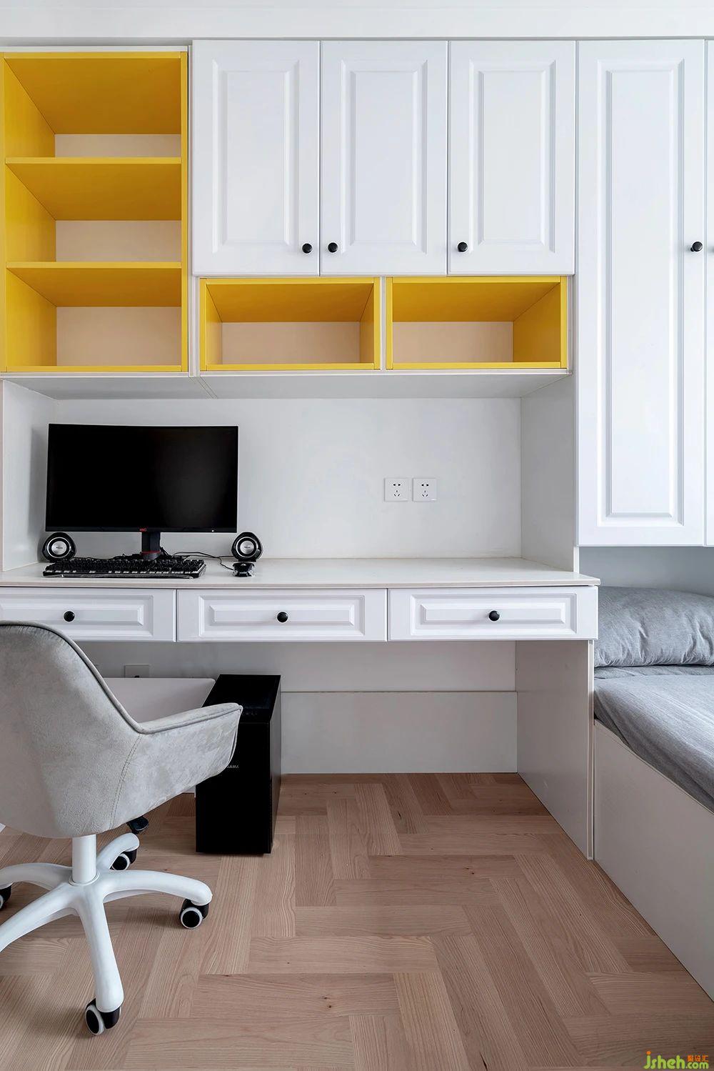 整体材质以白色为主,黄色的套格做了一些跳色。双人位的书桌足够满足男女屋主同时办公的需求。