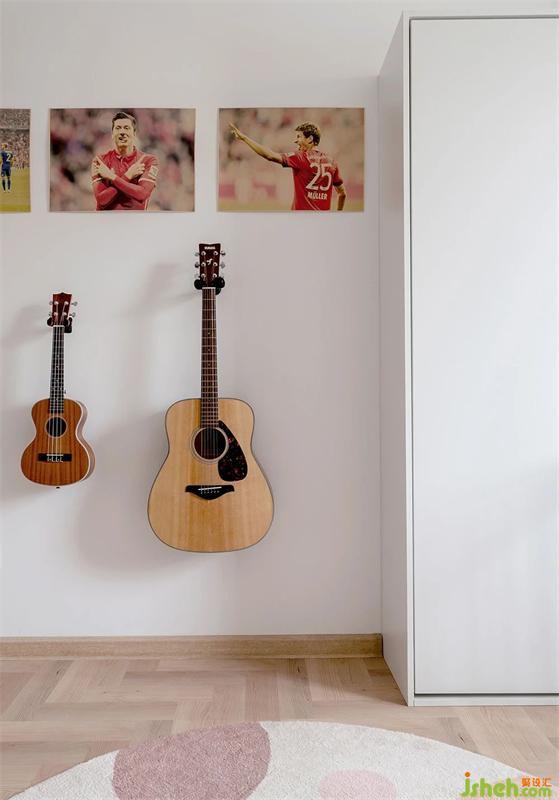上翻床一侧悬挂的吉他,尤克里里。还有屋主所喜爱的足球明星。