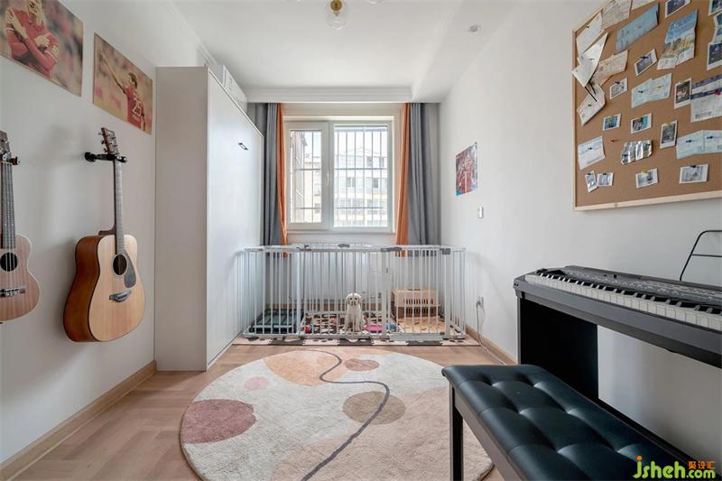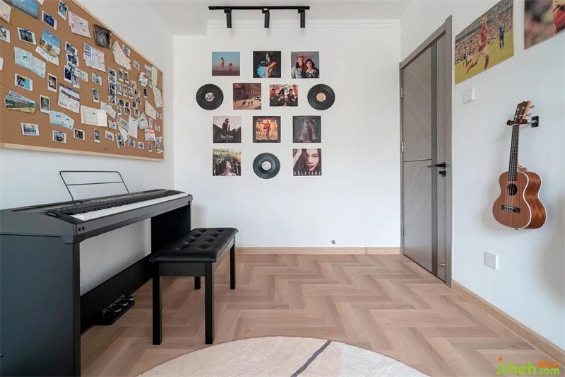 北向卧房做为娱乐空间使用,墙面的音乐海报以及黑胶唱片结合,整体的做了一个背景墙面。钢琴上方做了软木墙板,做为他们的记录墙,记录着他们的各项事宜。