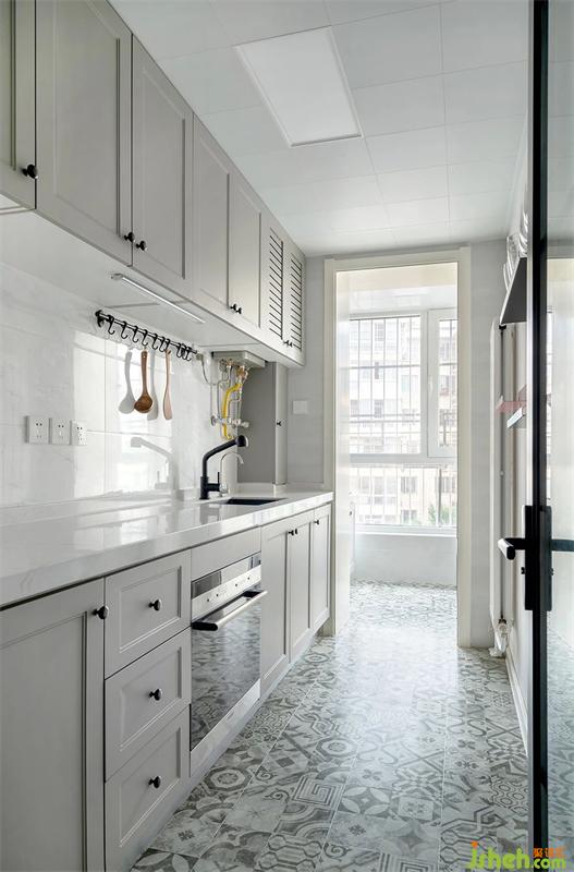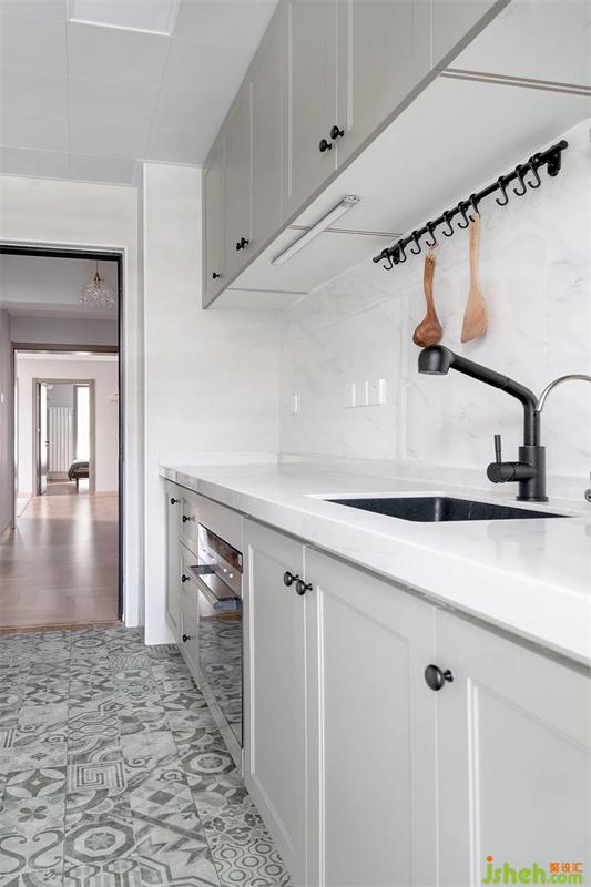 厨房空间顶面,考虑到后期方便检修采用了铝扣板吊顶。由于厨房空间整体以无色系为主,所以地面地砖选用了灰色花砖,来给厨房空间一些灵动感。