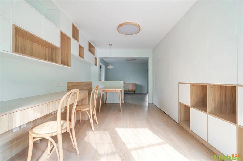 书房右侧是整面墙的储物柜,进深600mm,衣服可以全部收纳进来,轻松换季。敞开格是两个孩子的玩具收纳区域,有了固定的区域,更方便分类。