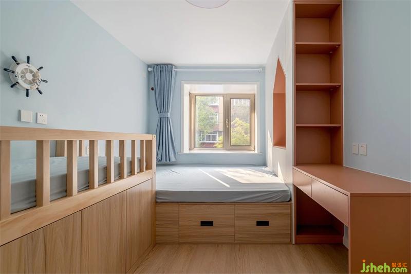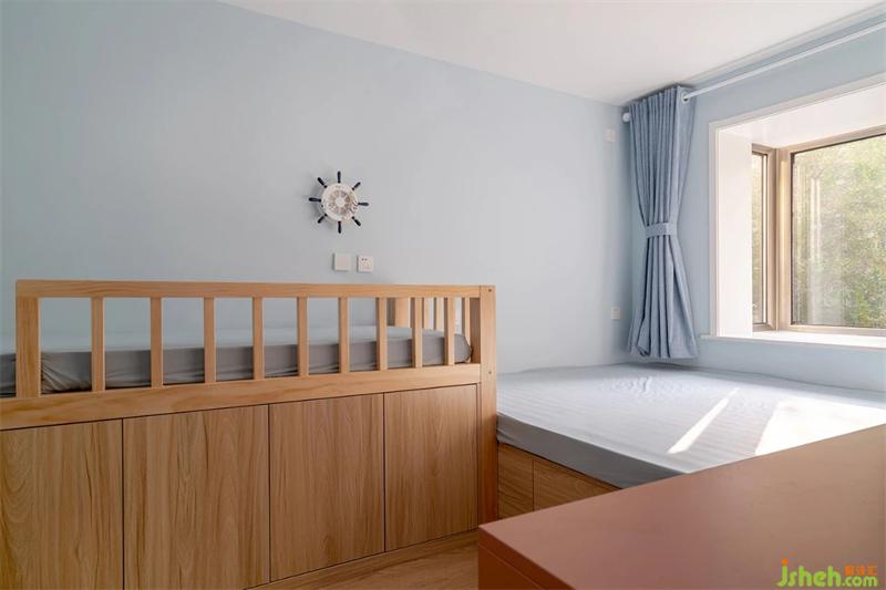 朝南的儿童房,定制了超大的榻榻米睡眠区,旁边加了独立的单人床,轻松的容纳下一家四口的睡眠空间。