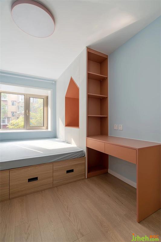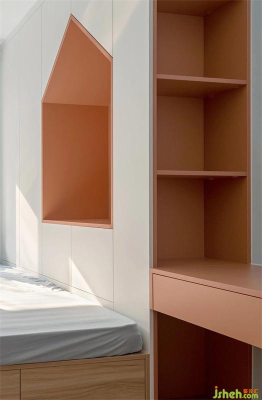 儿童房书桌还有敞开格做了橙色,饱和度相对高一些,跟墙面做一个强烈的对比,激活空间。