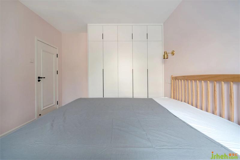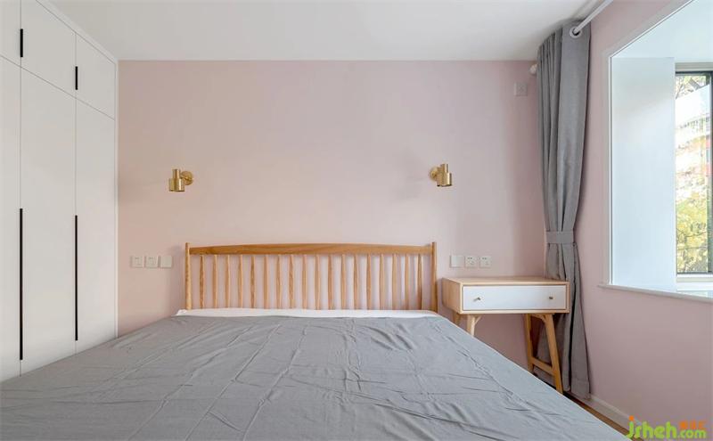 装修设计应屋主要求,墙面刷了女主喜欢的浅粉色。黄铜材质的壁灯质感还是很强的,床和梳妆台都是购买成品。
