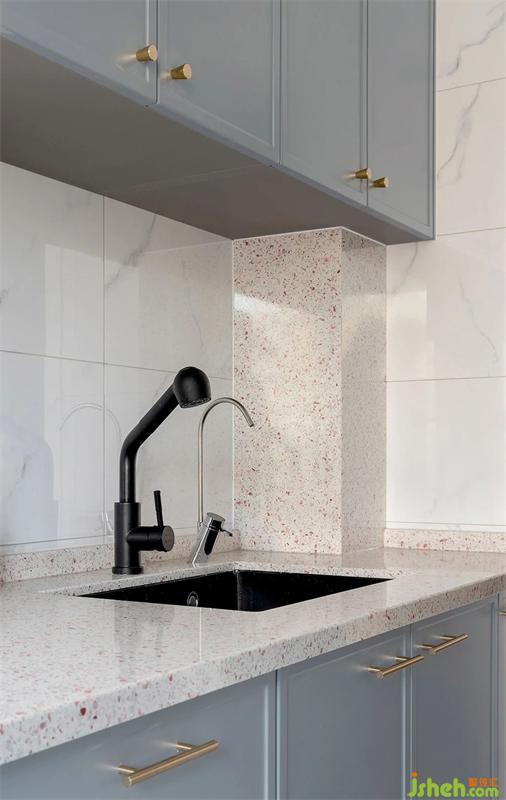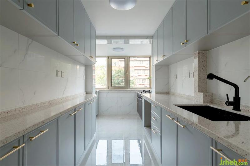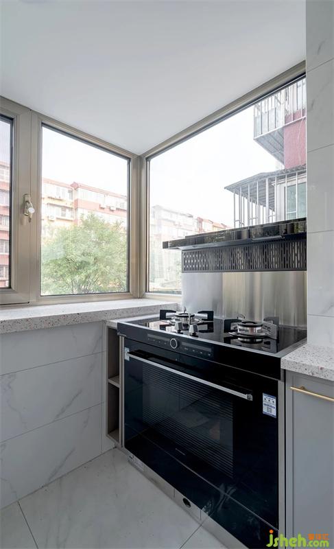 厨房增加了储物空间,装修设计利用阳台的空间,把灶台和洗衣机都放了进来。窗户做了外飘窗,扩大了炒菜区域的操作范围。