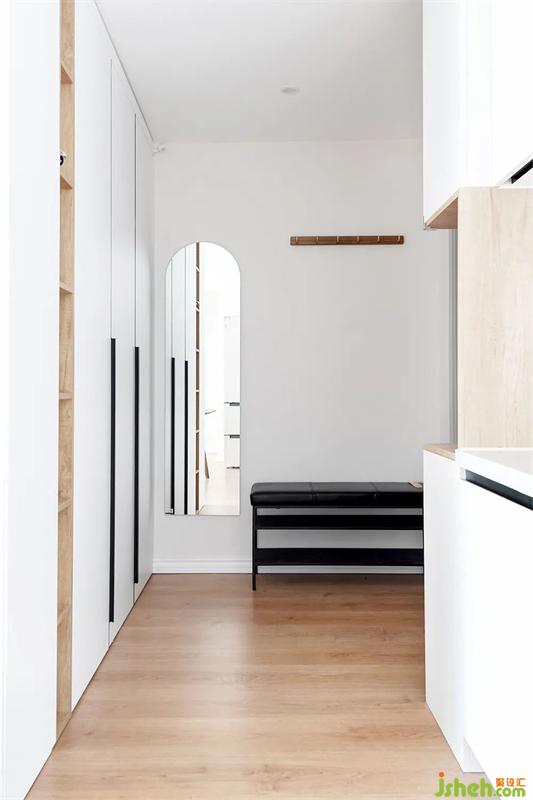 门厅增设衣帽鞋柜,挂衣区,小件物品收纳,天津装修设计以及换鞋凳和穿衣镜的空间,让门厅功能更完善,使用更方便。