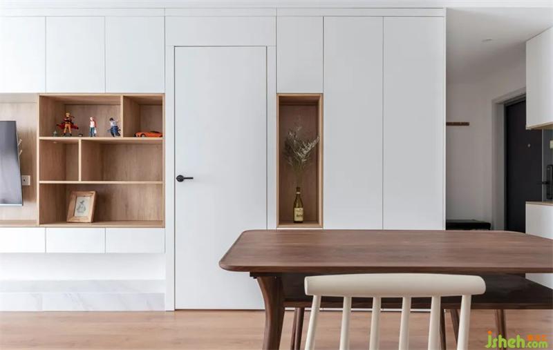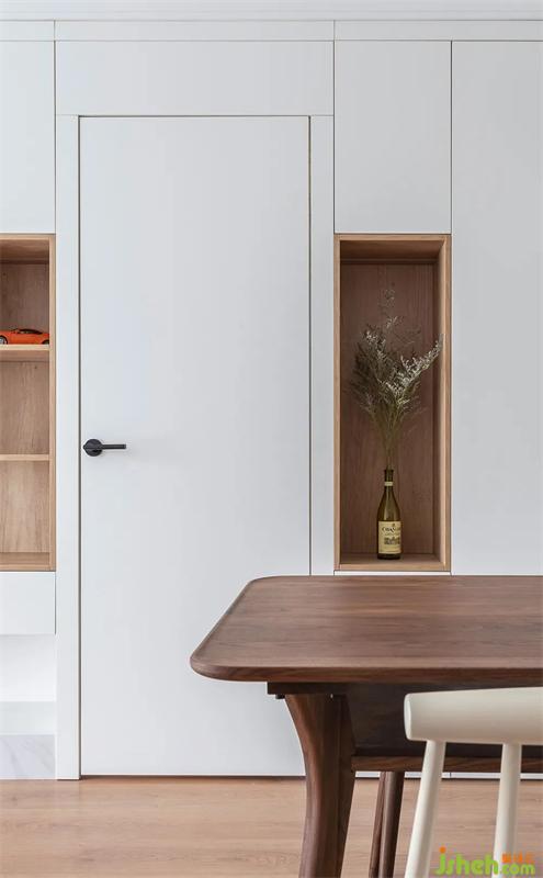 餐厅相对应的收纳柜,有藏有露。原设计是想放置大型乐高空间,无意之间放置了一个花瓶,比起乐高,使空间更加自然,更加有生机。开放格也做了套色,与电视墙相呼应。