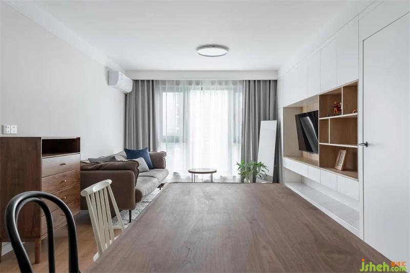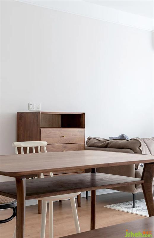 沙发旁边设置小边柜,承担杂物和小件物品的收纳。