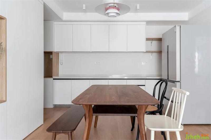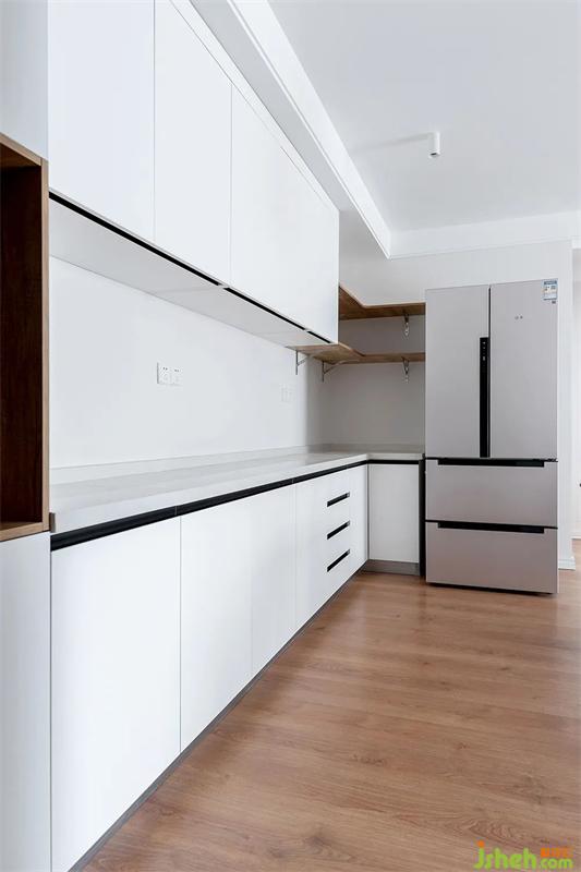 门厅进入客厅,首先是西厨房空间。设置了一整排的台面和吊柜增加储物,台面上可以进行简单的食材加工。旁边放置冰箱,满足周一至周五的居家使用。