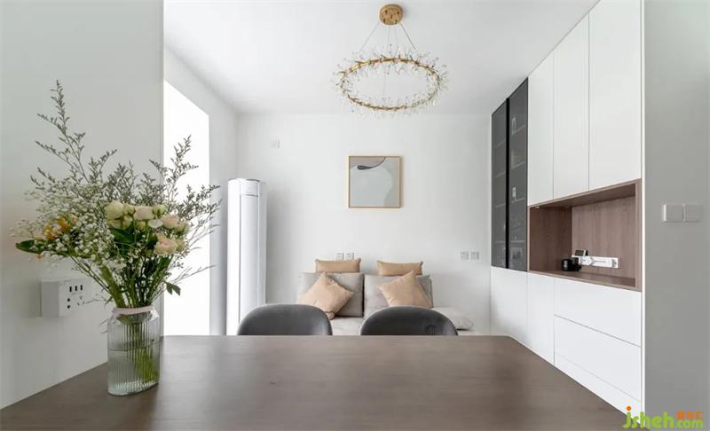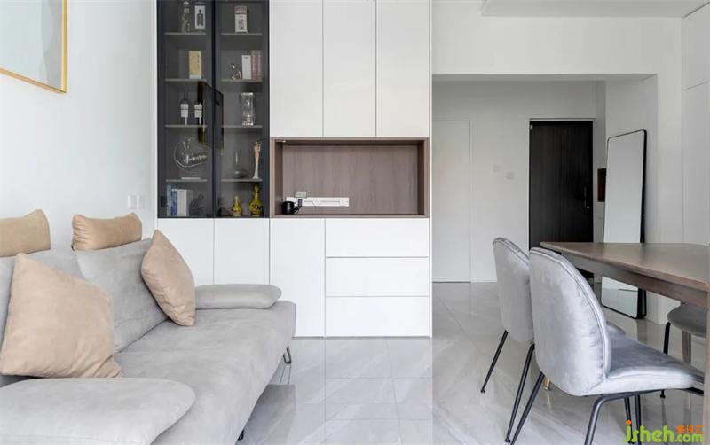 天津家居设计为保证空间整体层高,没有做太多的吊顶。沙发的旁边安排了一组收纳,来满足展示和备餐需求。暖灰色的亮光砖有放大空间的效果,营造简洁随意的氛围。