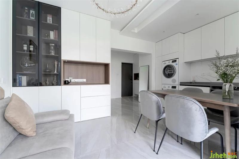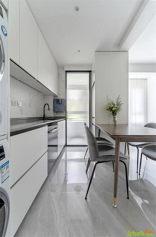 厨房入口的家政柜,内嵌了洗衣机以及烘干机。旁边是一整排操作台和收纳空间,让使用功能上得到很好的衔接。