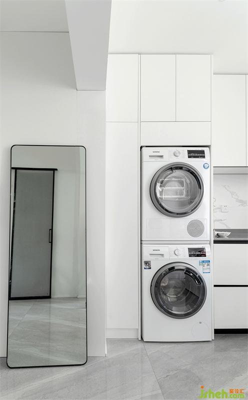 洗衣机烘干机做了内嵌,与原结构墙中间增加了一组家政柜,把好用的清洁工具都配齐了,功能丰富不浪费任何角落。