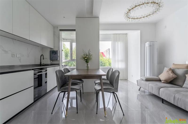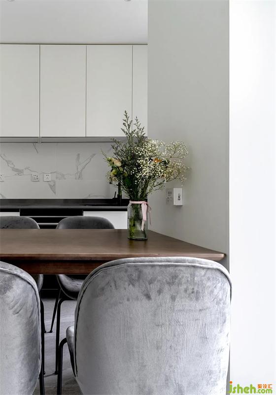 把烟机灶具外移到阳台,还增加一墩厨房面积,极窄长虹玻璃移门隔绝油烟。爵士白墙砖与灰色哑光台面,搭配白色爱格板橱柜,洁白明亮的空间体现现代质感。