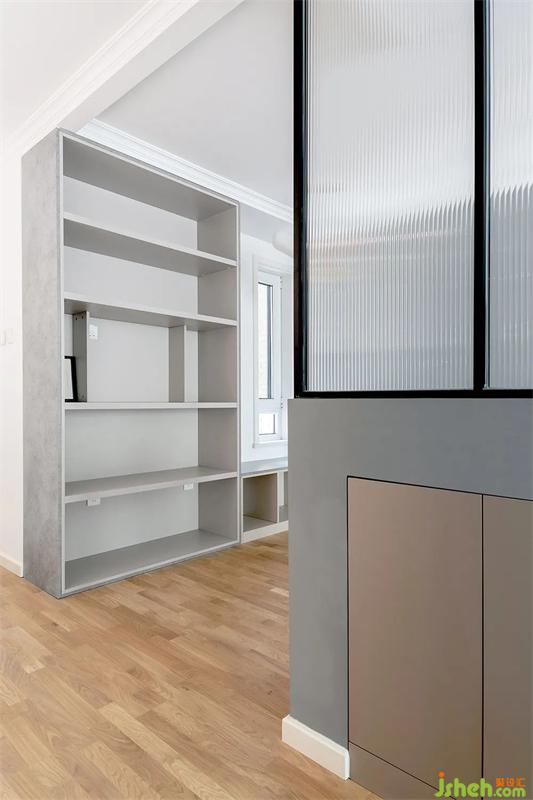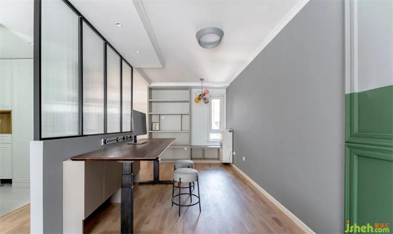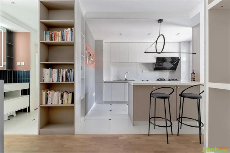 拆除了原本的墙体改造成开放式厨房,用一张宽度970mm独立岛台过度。较高的吧椅可以有效提升入座的舒适度。侧面是一组整高书柜迎接动线,让整体过度更自然。