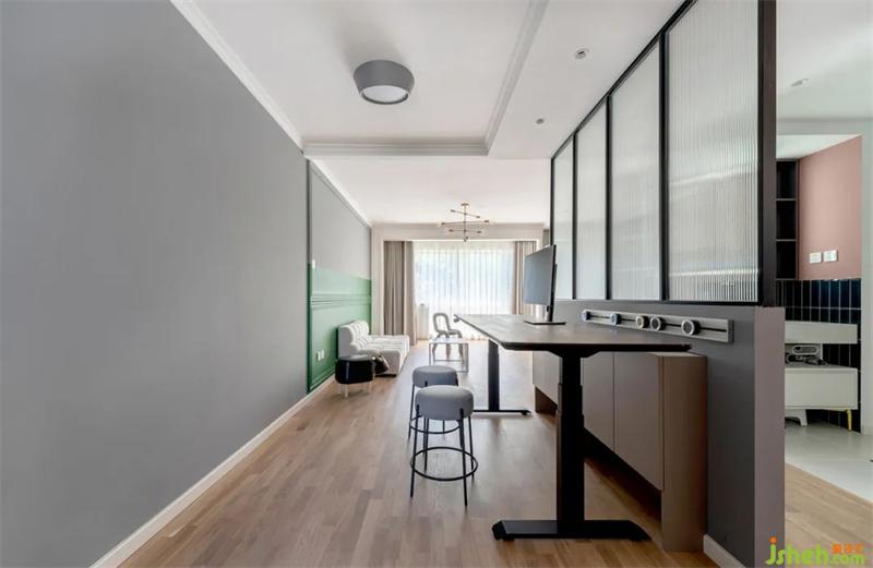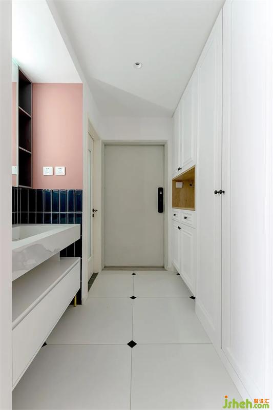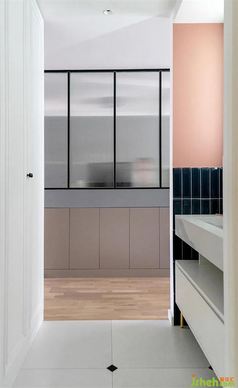 玄关一进来,迎面看见的就是长虹玻璃+隔断柜组合而成的屏风,阻隔视线私密性拉满。北京装修设计左侧是玄关收纳柜,右侧则是干湿分区外置洗手台。