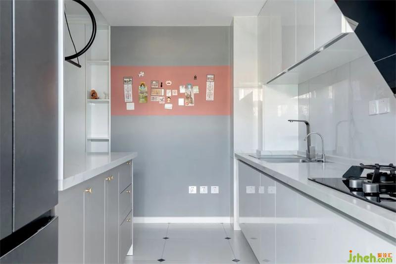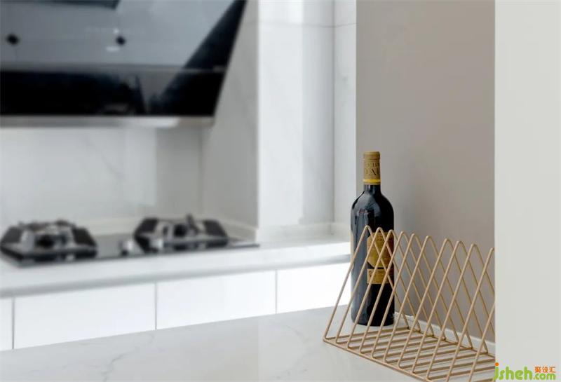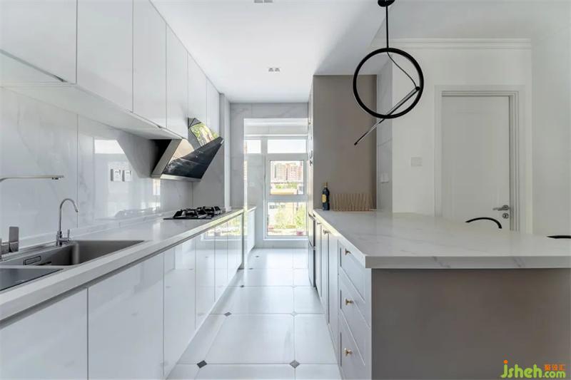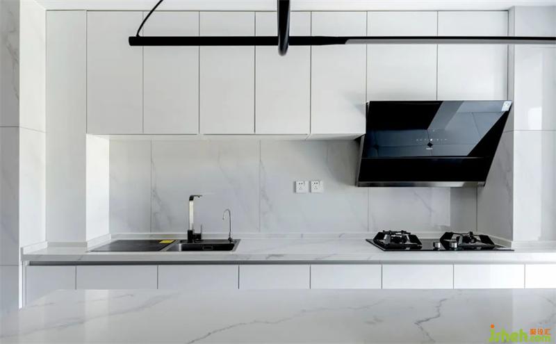 按压式的柜门无把手,避免磕碰使用起来也更流畅。白色石材的台面与墙面,搭配白色橱柜,明亮的色调让空间看起来更加宽敞洁净。