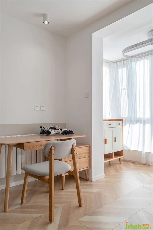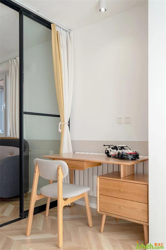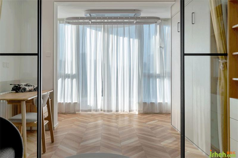 客厅与次卧中间,采用玻璃移门+窗帘来进行分割,平时可以做为屋主的工作间使用,也预备给未来的宝宝,预留出了足够的活动空间。