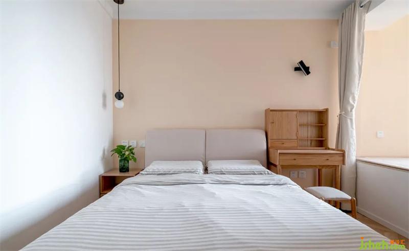 在地台与床体之间,安排了绝对不可舍弃的梳妆台。简约的壁灯,既可以满足美妆照明需求,还能充当夜读灯使用。素色的床品与肉粉色的墙面,相辅相成,整体干净明了。