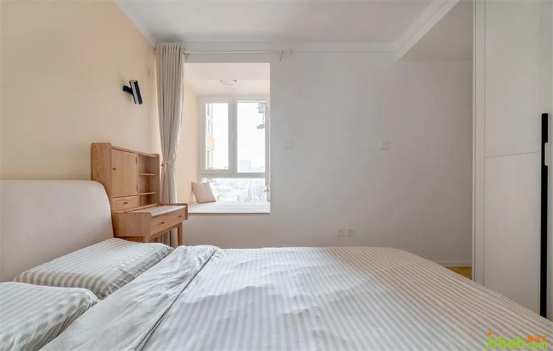 主卧空间把原本属于厨房的一小块阳台,纳入囊中,规划进来成了地台,具备储物也具备休闲功能。