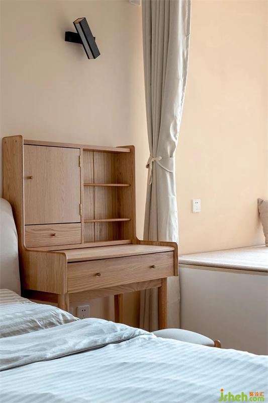床头一角,梳妆台是女生屋主精挑细选的,隔板可以用来摆放她的化妆用品。旁边的柜门内暗藏一张梳妆镜,绝对避免镜子冲门的问题。