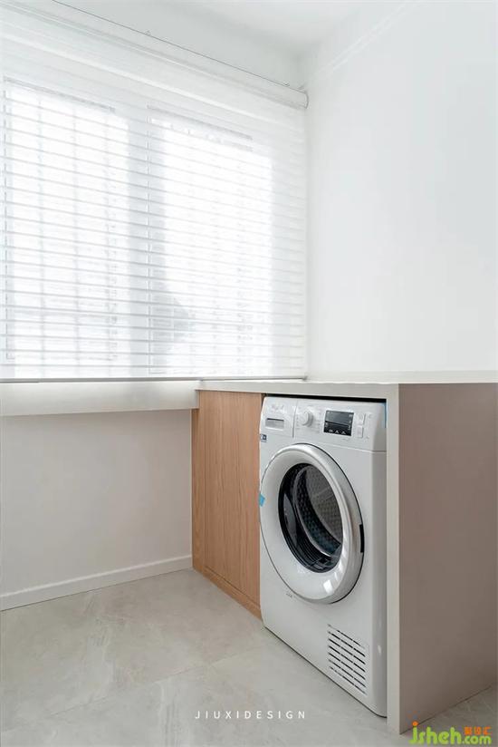在南阳台增加了内嵌式烘干机,旁边还有一组收纳柜,上面可作为台面用来熨烫,叠放衣服,增加了操作空间。