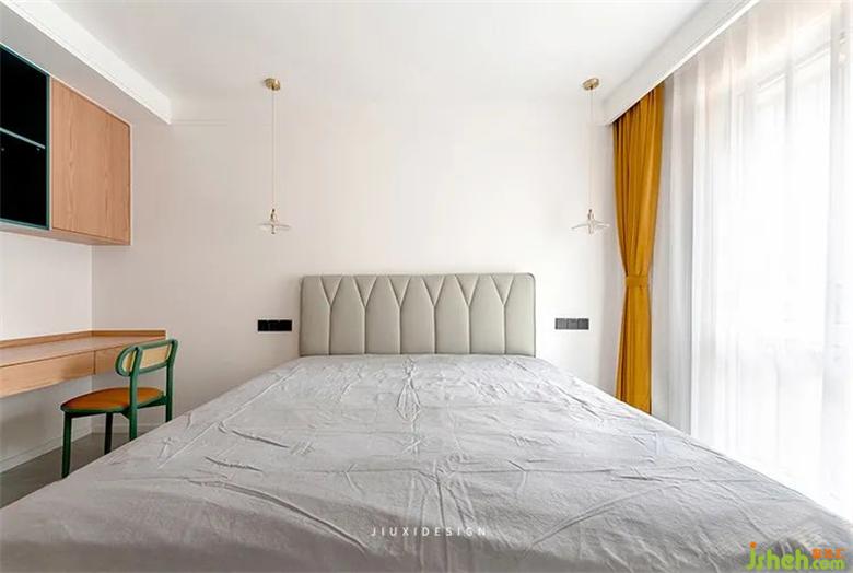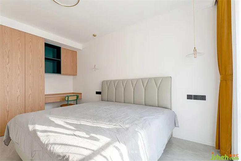 主卧空间依旧延续客厅风格,白+原木色搭配装修焦糖色的窗帘,成为了整个空间的主角。