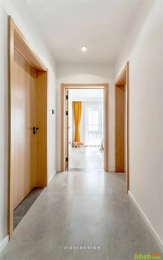 走廊空间干净清爽,视装修线通透。原木色的门保证隐私的同时,温暖了整个走廊空间。