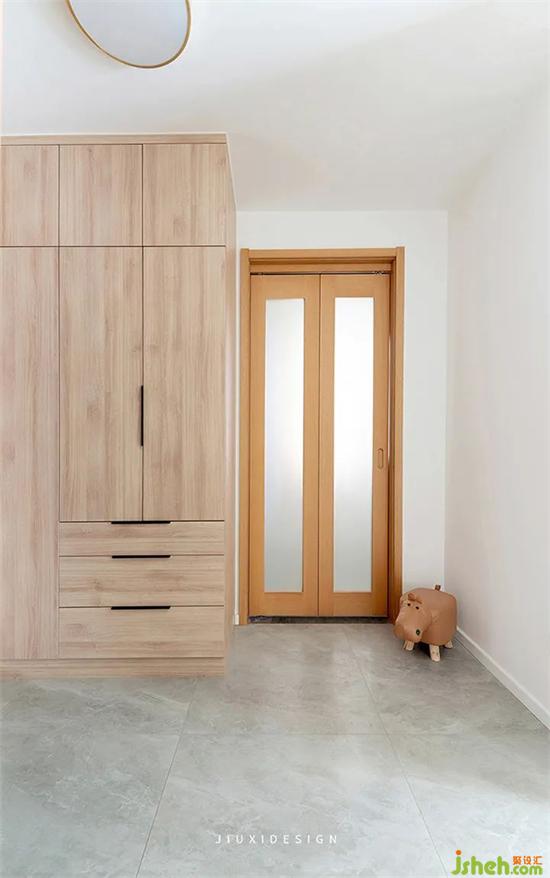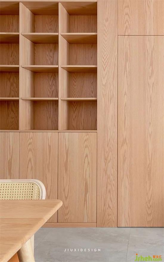 餐厅柜选了原木色与长虹玻璃结合的款式,有点小复古,强大的收纳能力,还不显装修压抑,成了不二选择。