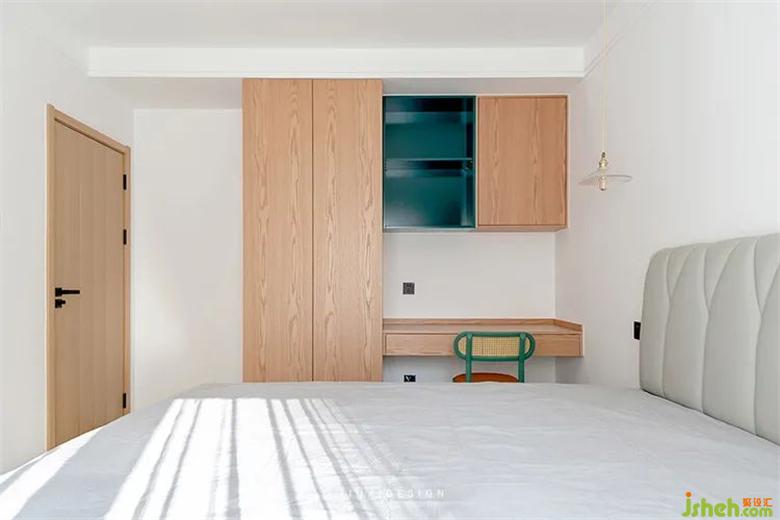 床一侧增加了衣柜装修和梳妆台,方便换衣和梳妆。