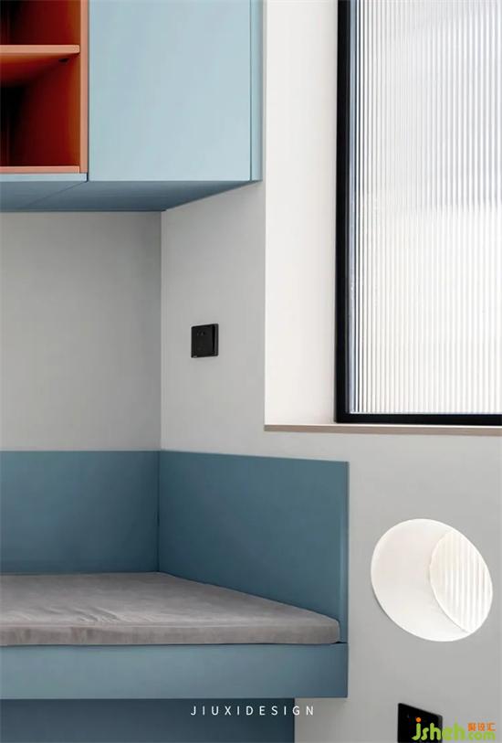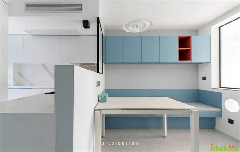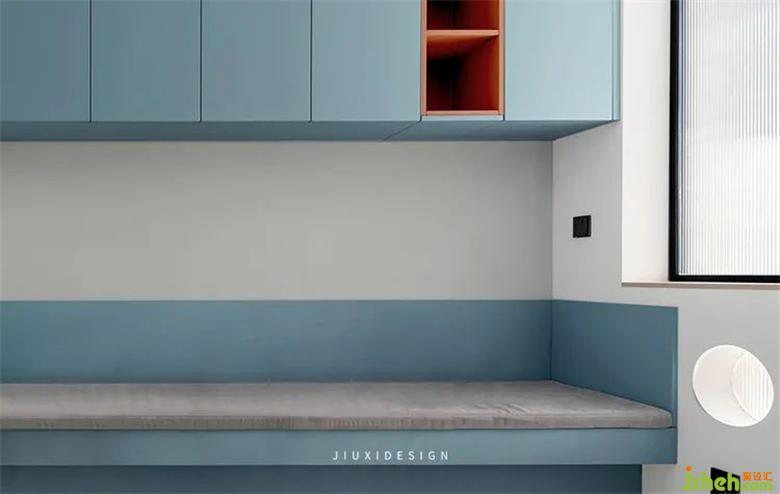 蓝色定制家具搭配白色墙面,给人一种干净清爽的感觉。蓝白相间的色彩搭配,也赋予空间一种浪漫装修设计的感动。