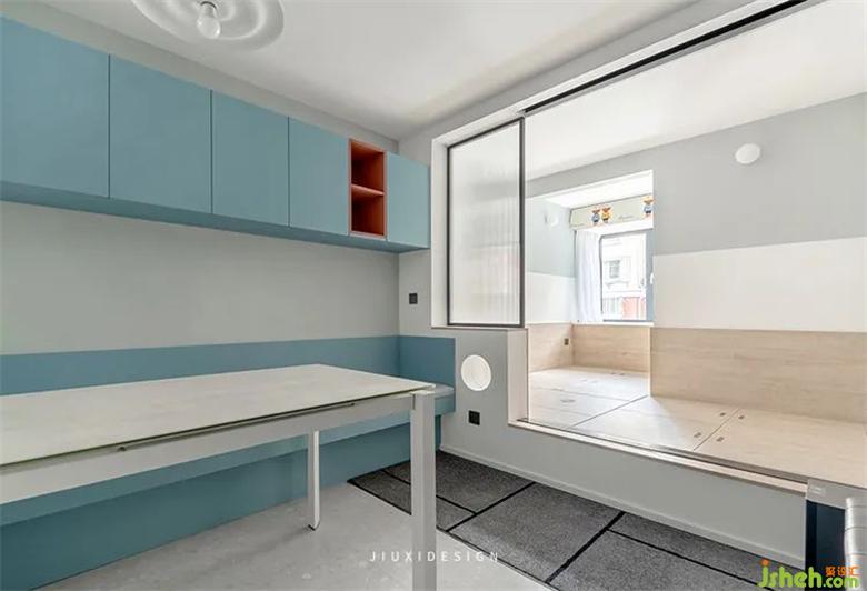 2.儿童房采用地台的形式,满足业主的储物需求量。长虹玻璃移门作为装修设计隔断,保证了空间良好的采光性。