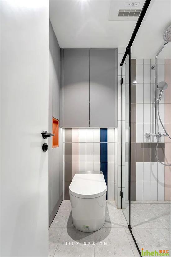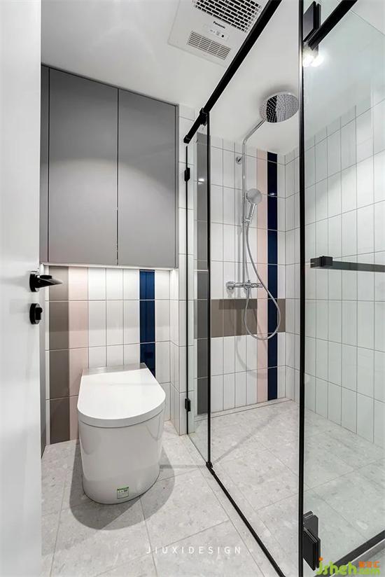 隐藏式水箱顶部内嵌收纳吊柜,充分利用每一寸空间。黑色窄框玻璃隔断打装修设计造的一字型淋浴房,避免空间显得压抑。