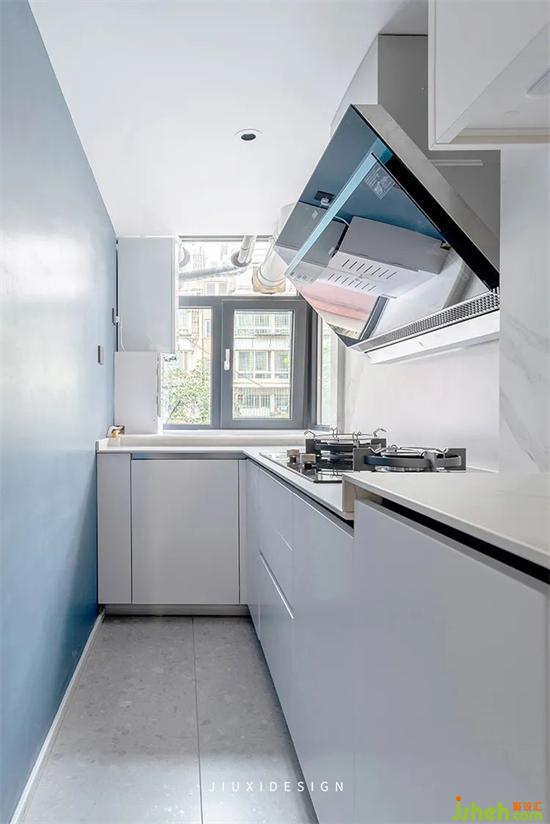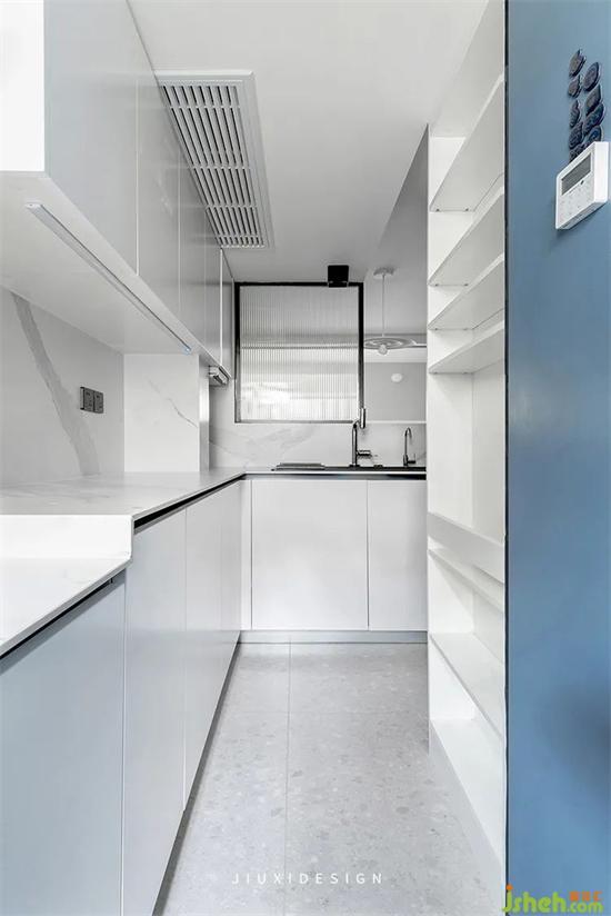厨房以白色为主色调,更显干净整洁。与客厅之间用长虹玻璃进行划分,同时避免采光受到影响。装修设计阶梯式操作台,贴合动线和习惯让切菜不累腰。右边的隔板柜,可以存放调料锅盖的用品。