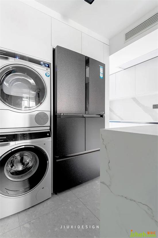 洗衣机+烘干机+双开门冰箱,与家政柜相装修设计结合,整体更显统一。同时还能留出800mm的过道空间,合理的利用空间提升动线的流畅性。