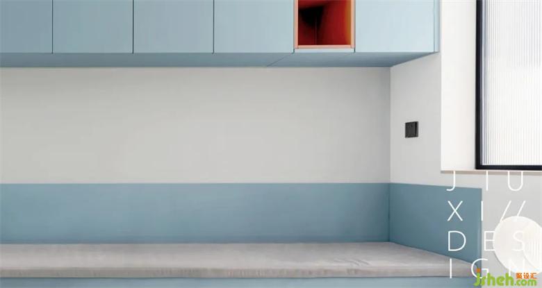 瓷砖选择的是马卡龙色长条砖,规格为100*300mm进行组合铺贴。这样的搭配不仅避免了单调,还尽显空间层次。