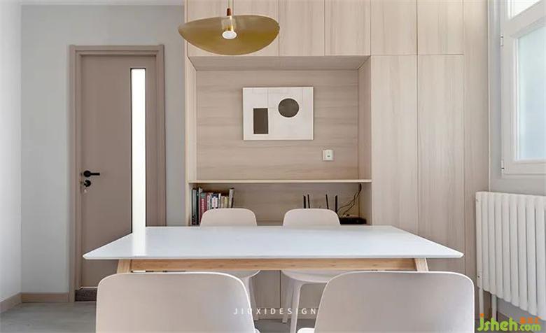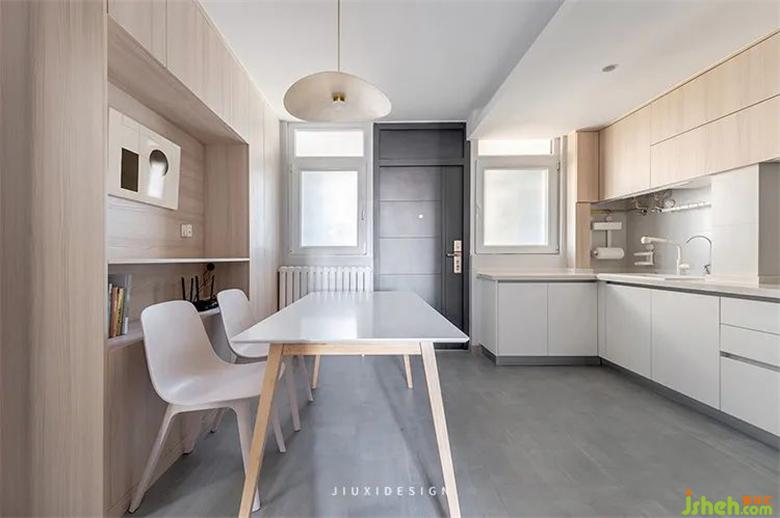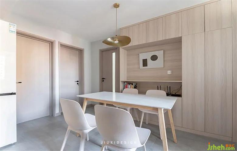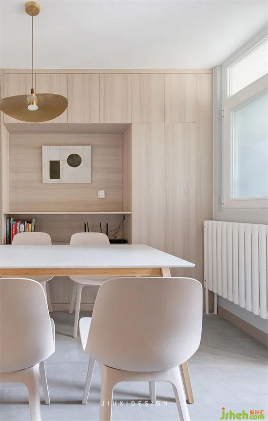 浅木色+纯白让餐厅看起来完整统一,没有做多余的装饰和摆设,纯粹到让每一平米都是情调。