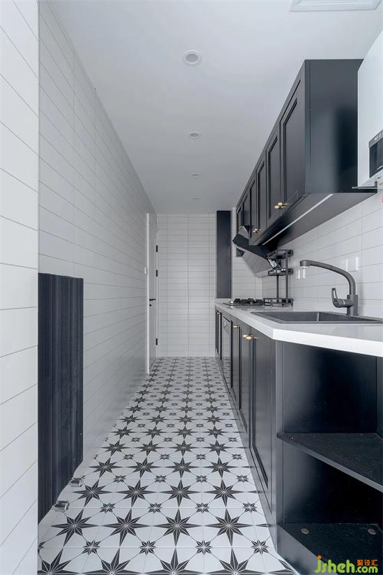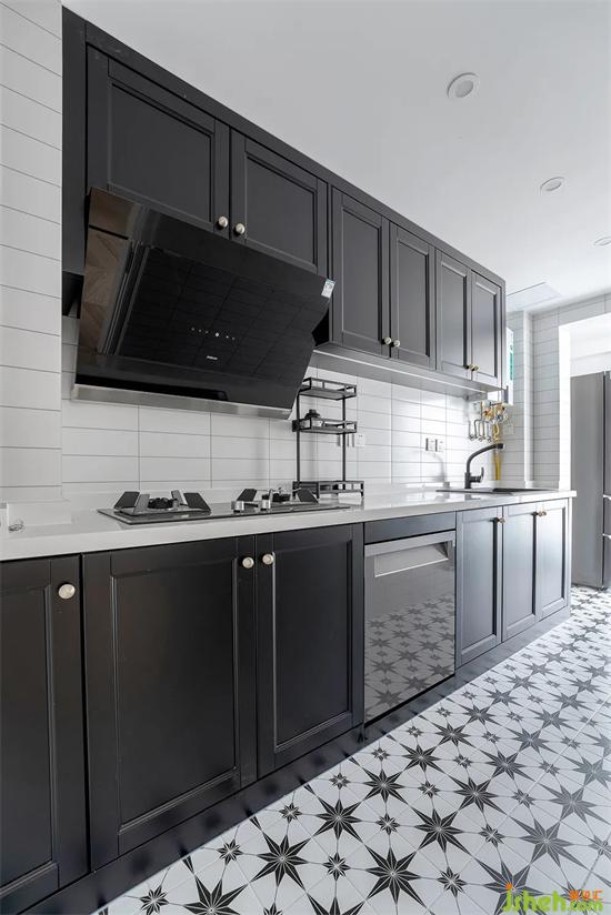 厨房选用了深色的柜体,黄铜把手与深颜色的柜体相得益彰。厨房顶面用了防水石膏板和筒灯的结合,柜体内嵌洗碗机,装修彻底解除洗碗的烦恼,200*200的花砖,让复古中带有几分俏皮。