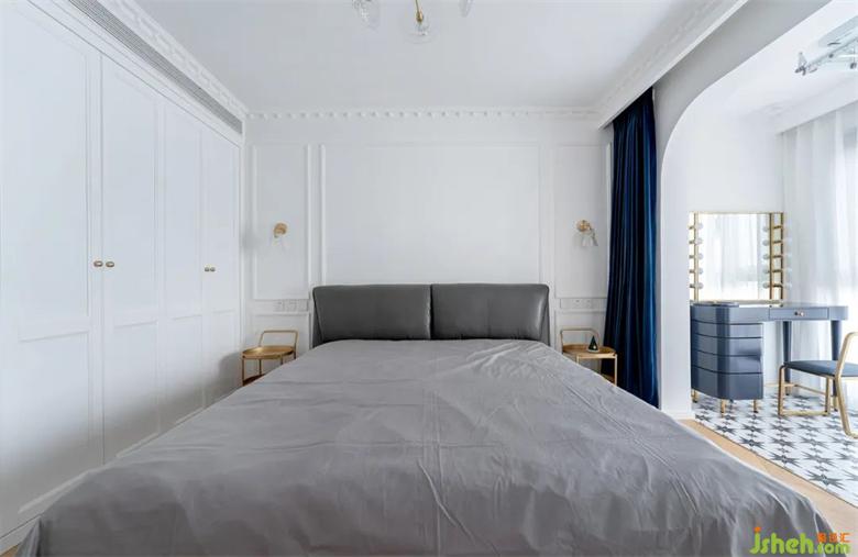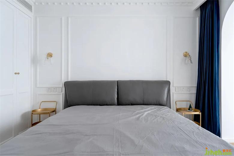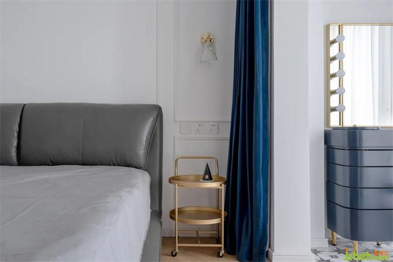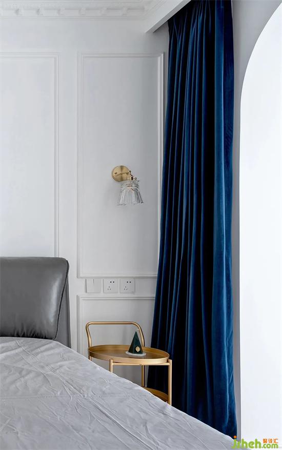 床头旁选用了可灵活推拉的盘式储物,拉丝黄铜的质感+深蓝色的窗帘组合高级感十足。