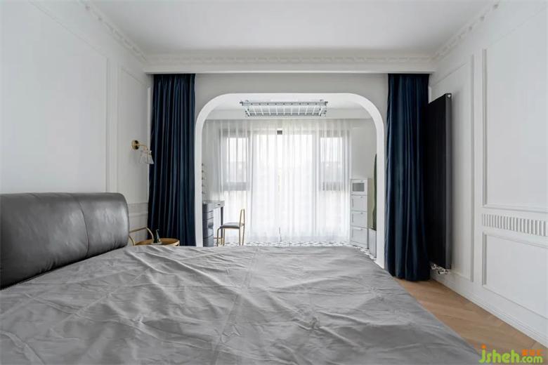 卧室阳台采用了可升降的晾衣架,方便晾晒,复古的深蓝色给卧室增添了几分神秘感。